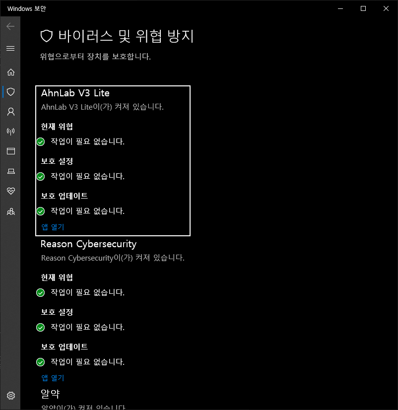 아래 화면의 바이러스 및 위협 방지로 들어가면 현재 PC에서 사용하고 있는 보안프로그램들이 나옵니다.