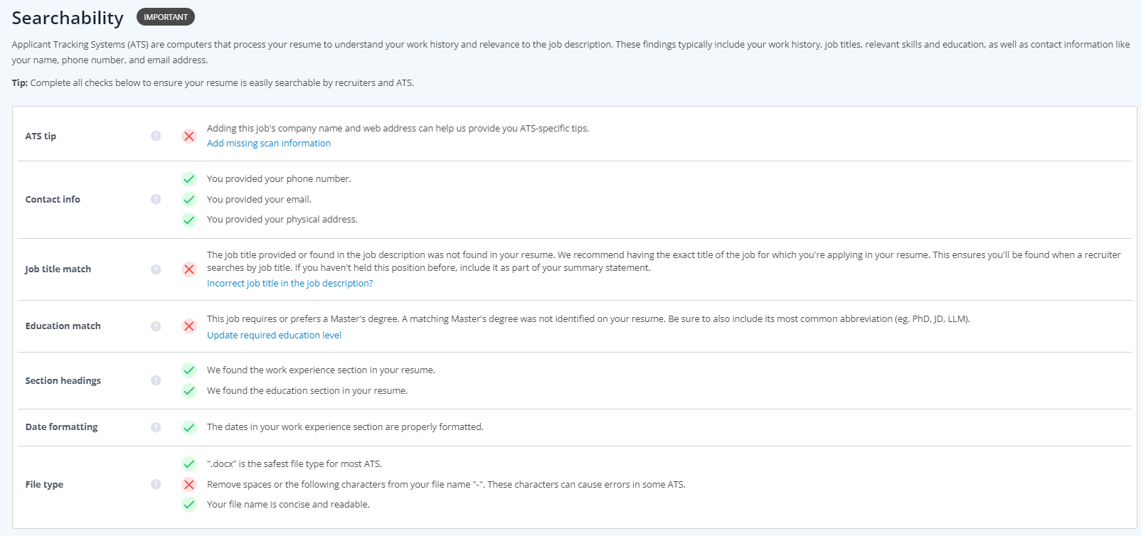 또한 Job Description에서 나온 단어를 다 사용했는지도 평가를 해줍니다.